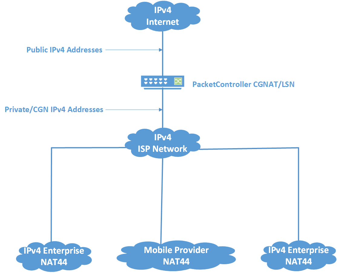 PacketController CGN solution is based on standards-based mechanism - carrier-grade network address translation (CGNAT), large-scale NAT (LSN), NAT444 or NAT44 - to reclaim existing IPv4 space.