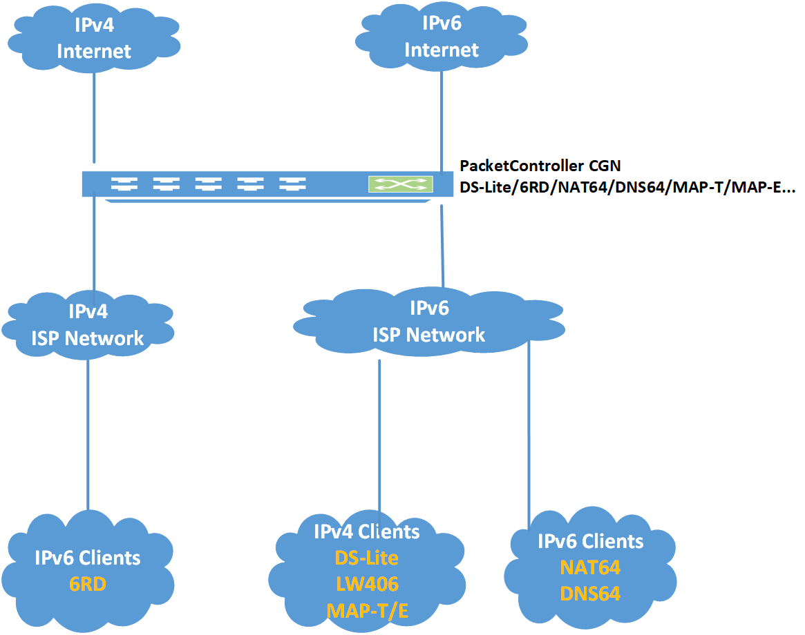 PacketController CGN solution provides comprehensive transition technologies help bridge the gap between IPv4 and IPv6 networks.