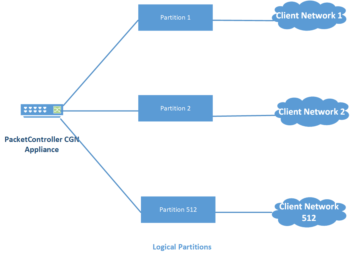 A PacketController CGN appliance can be partitioned into logical entities called partitions. Each partition can be configured and used as a separate PacketController CGN appliance.